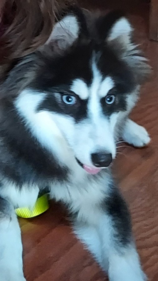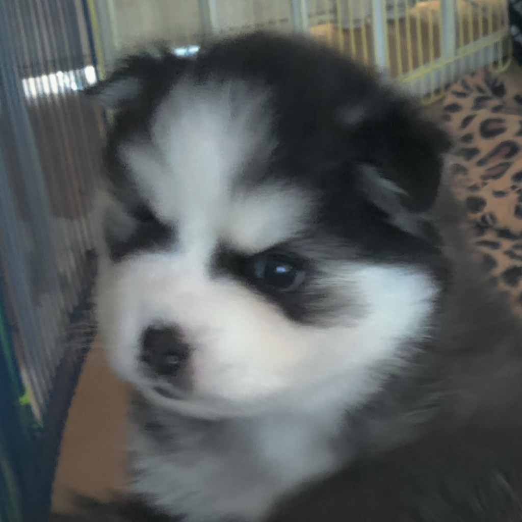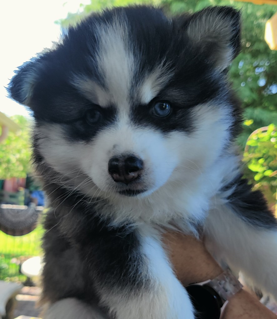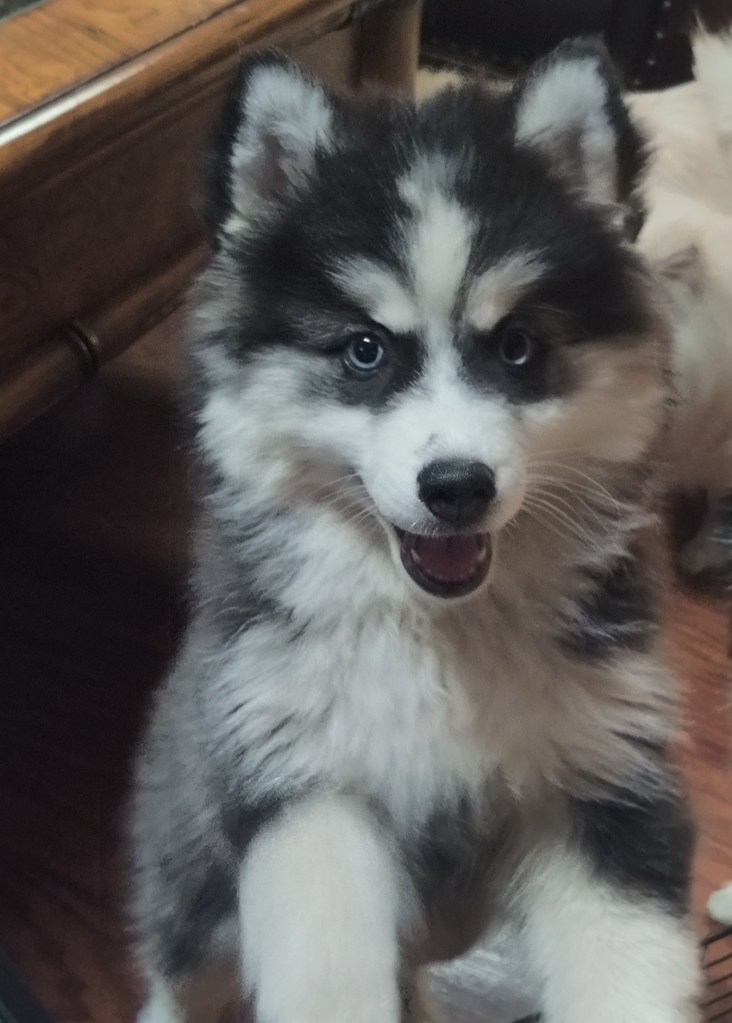 Available Pomsky Black and White Beautiful blue eyes . Born July 27, 2022 Sold